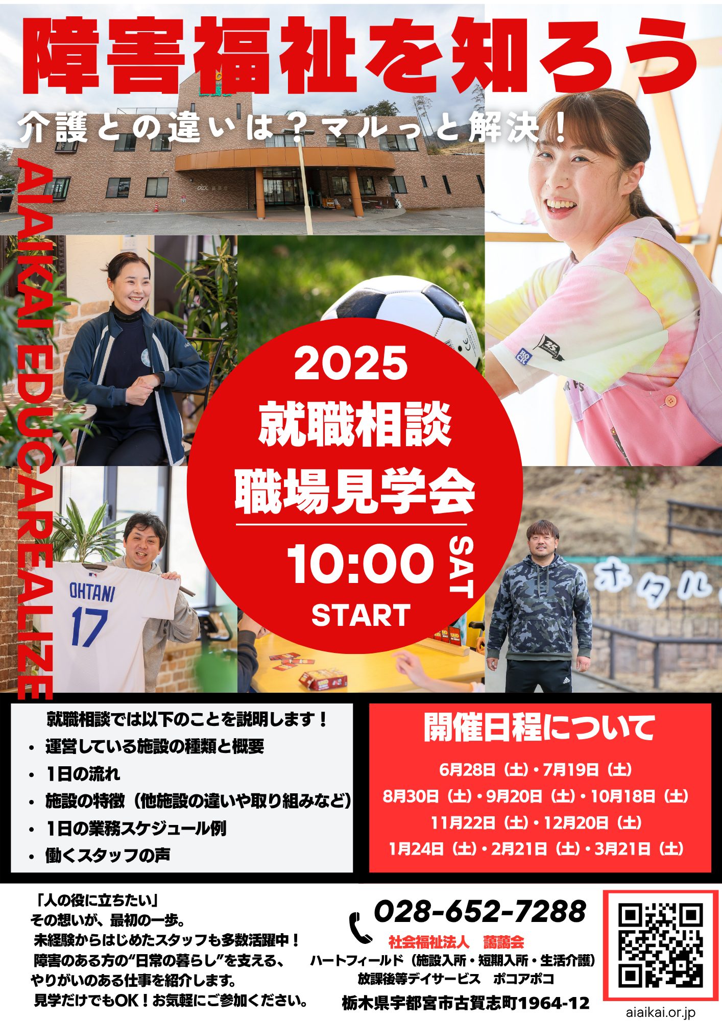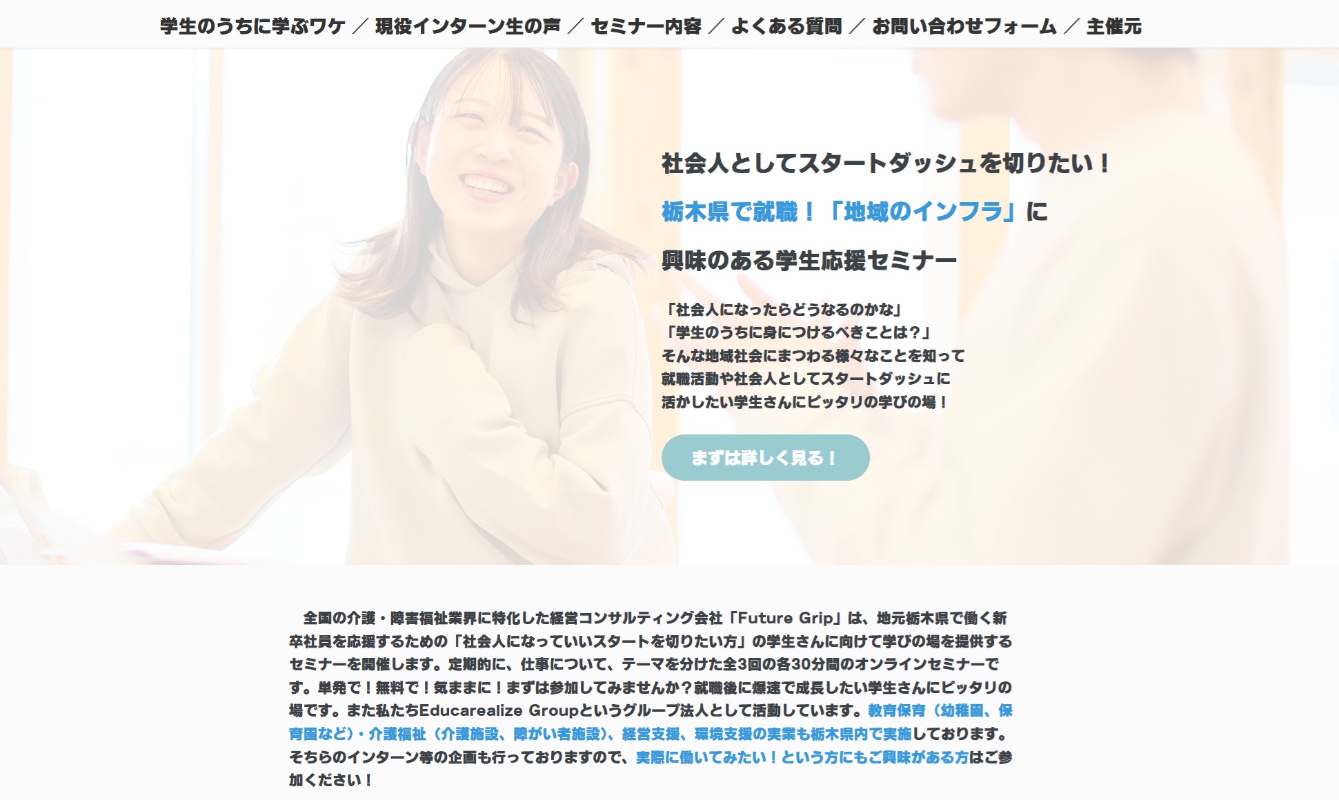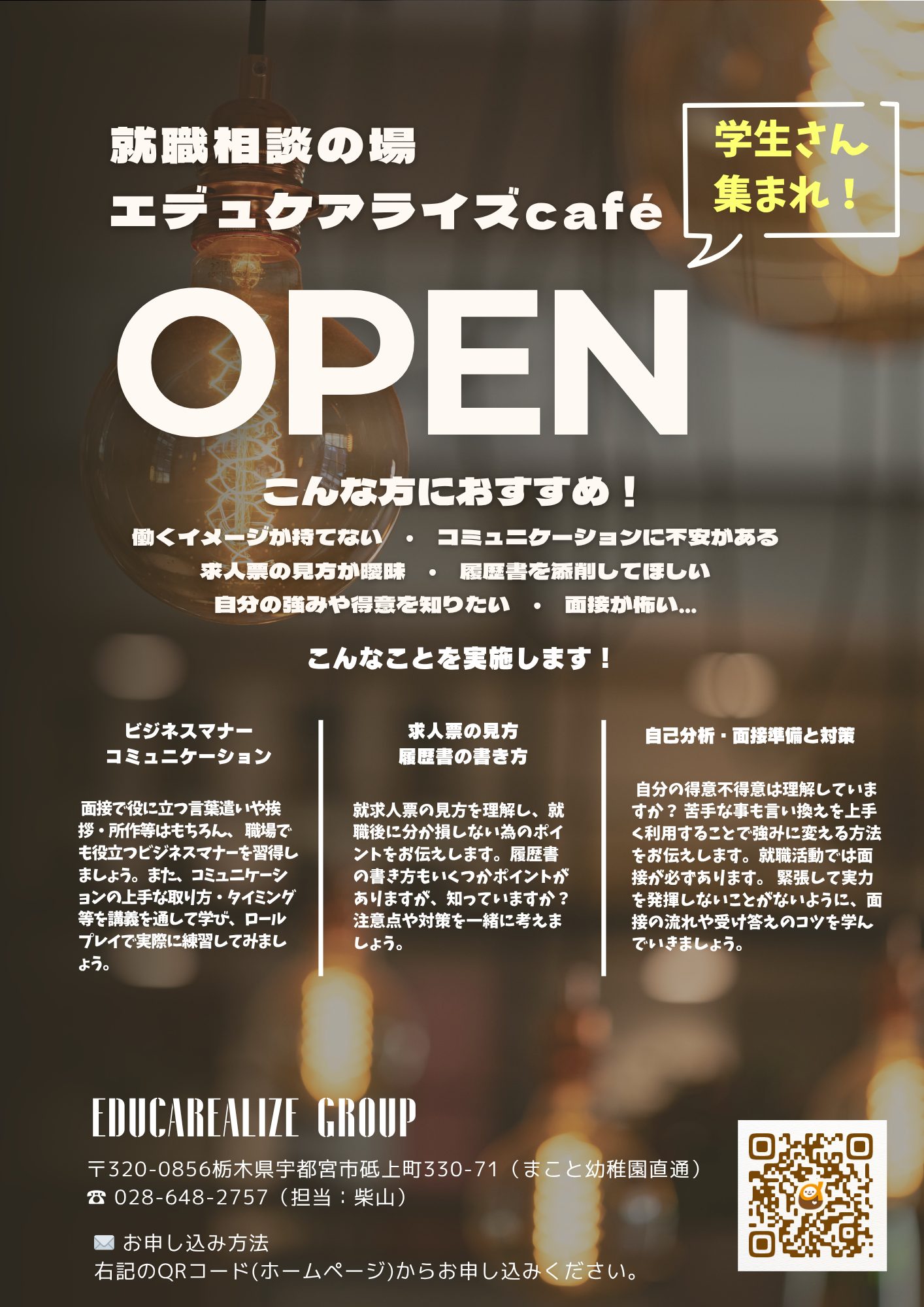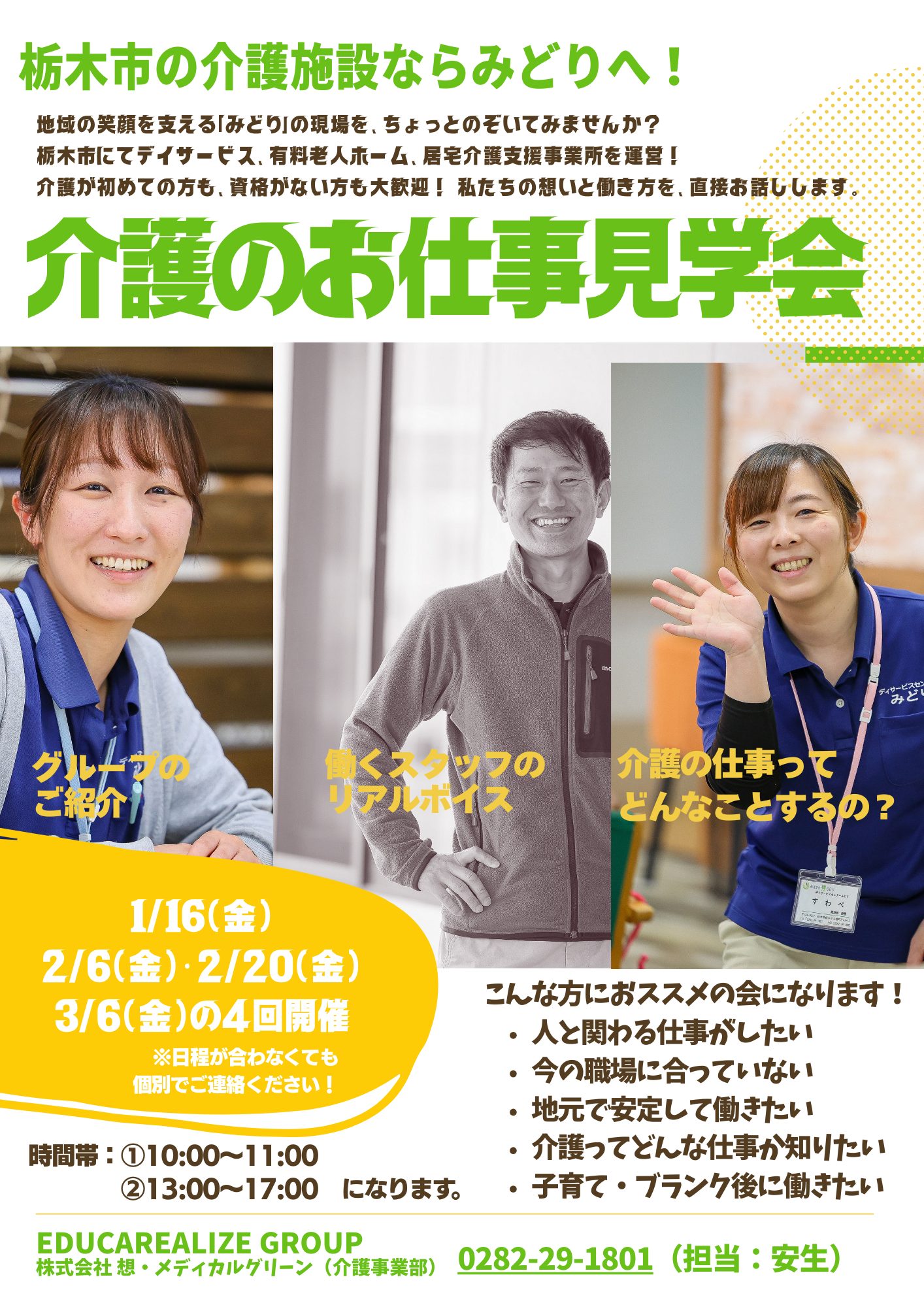 介護の仕事ってどんなことをするんだろう??Educarealize Groupは介護事業も行っております。現在、宇都宮市だけではなく、栃木市にて介護事業(デイサービス、居宅介護支援事業所、有料老人ホーム)を運営しています。2025年途中入社、もしくは2026・2027年度~就職等を検討している方向けに「介護のお仕事説明会」を開催します。「人生に彩りを添えたい」とコンセプトに活動している介護事業に興味がある方は、是非ご参加ください!詳細は以下のチラシをご参照いただき、日程をご確認いただき、ご参加ください!日程が合わない方は一度ご連絡ください!